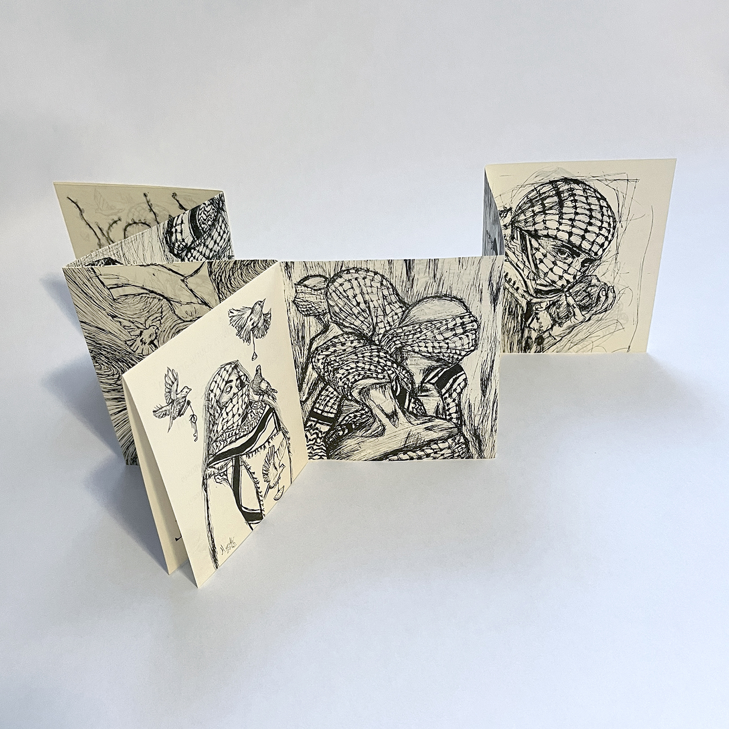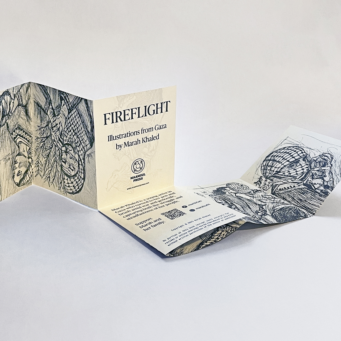 This accordian zine collects 14 illustrations by Marah Khaled, a young artist in Gaza who turned to her pen and brush amid war and genocide, capturing both the struggle and steadfastness of her people. Available for purchase as a risograph printed zine, or as a PDF, all proceeds will support Marah.
