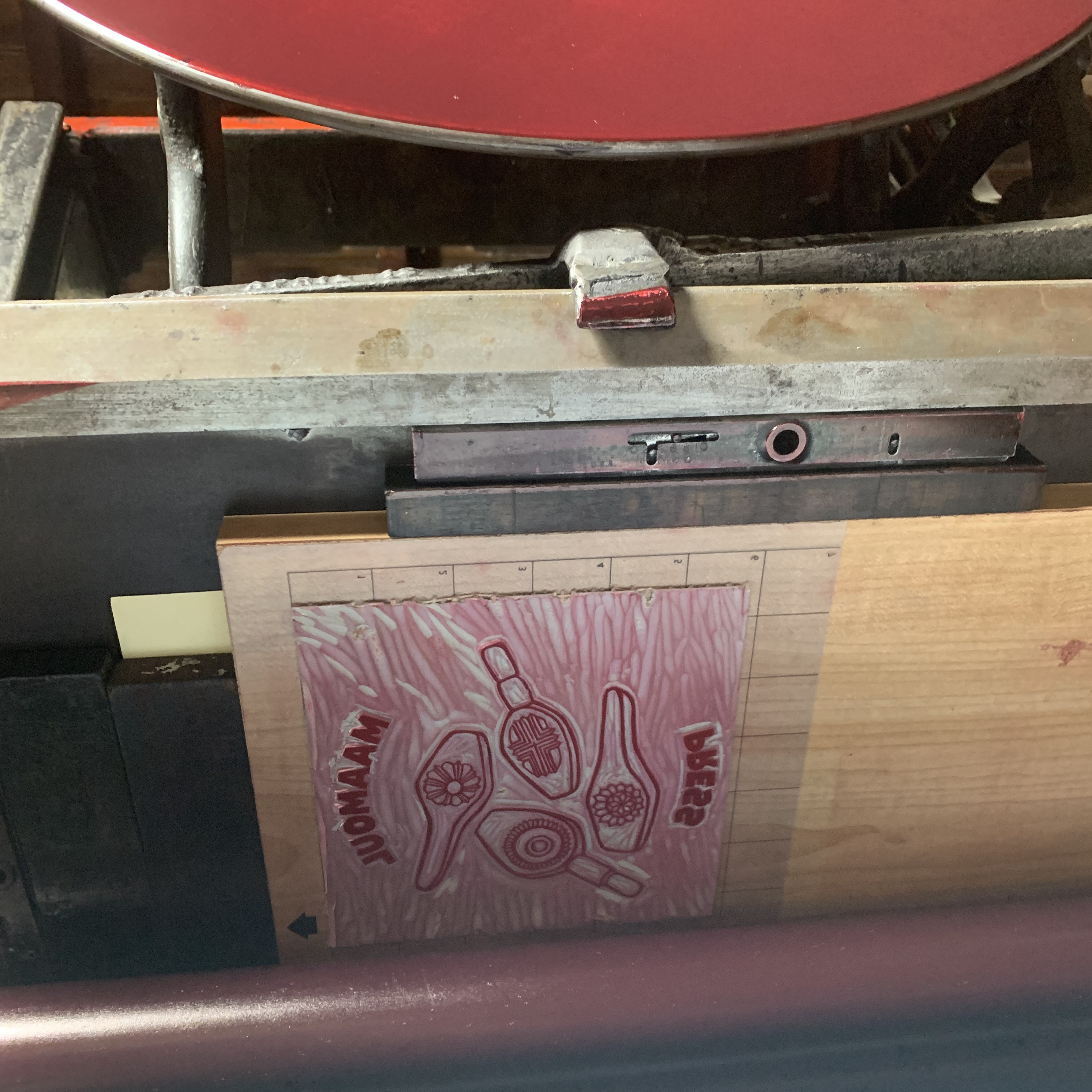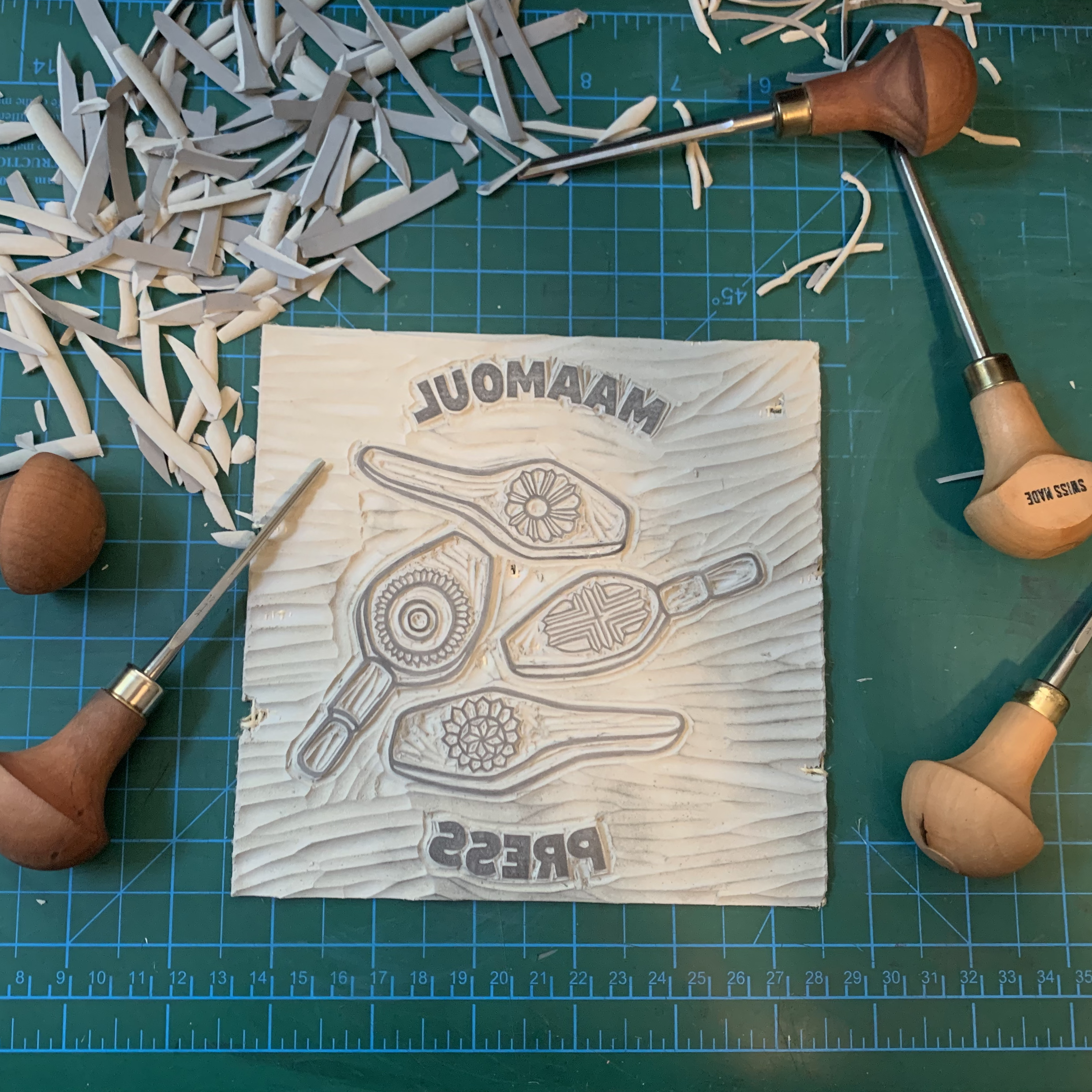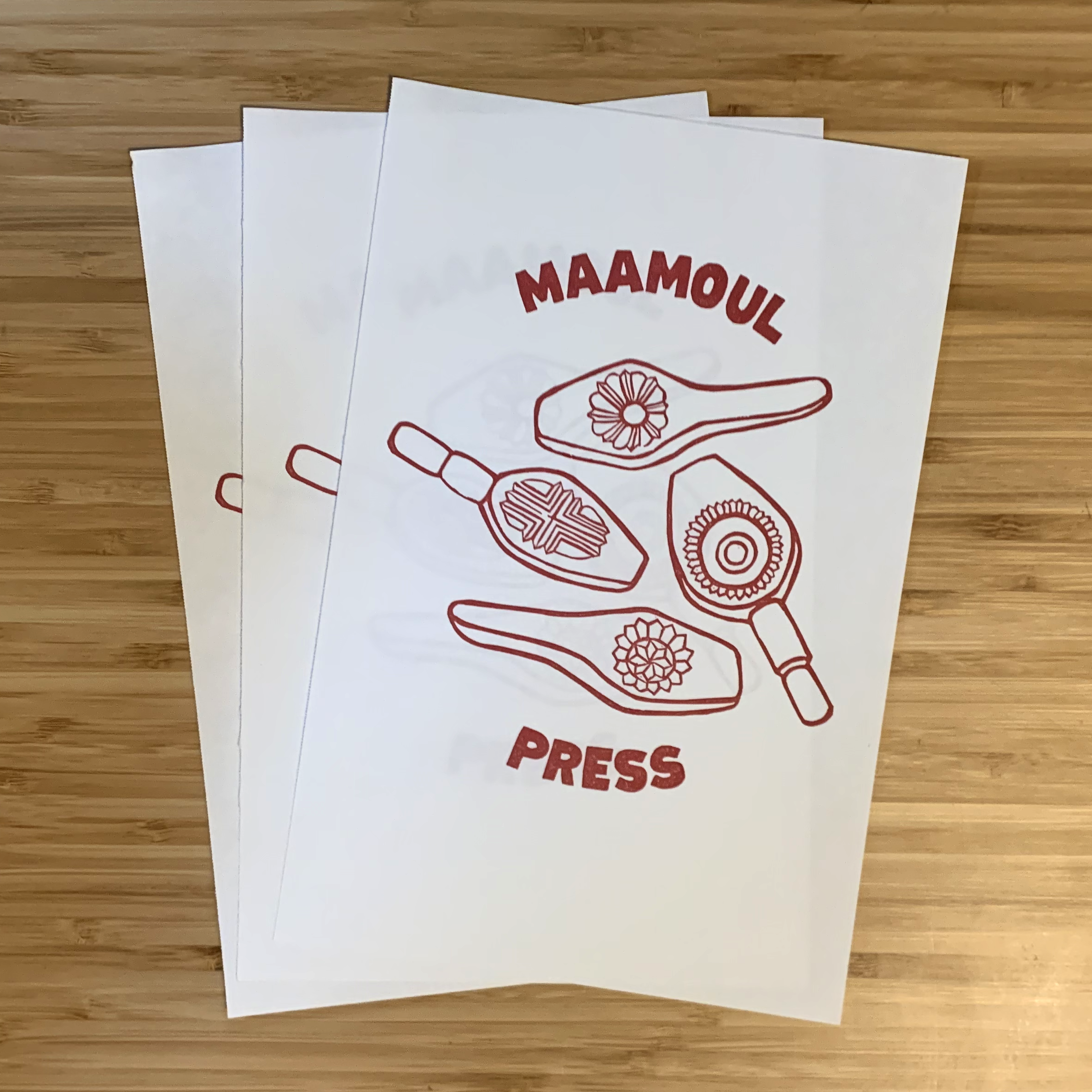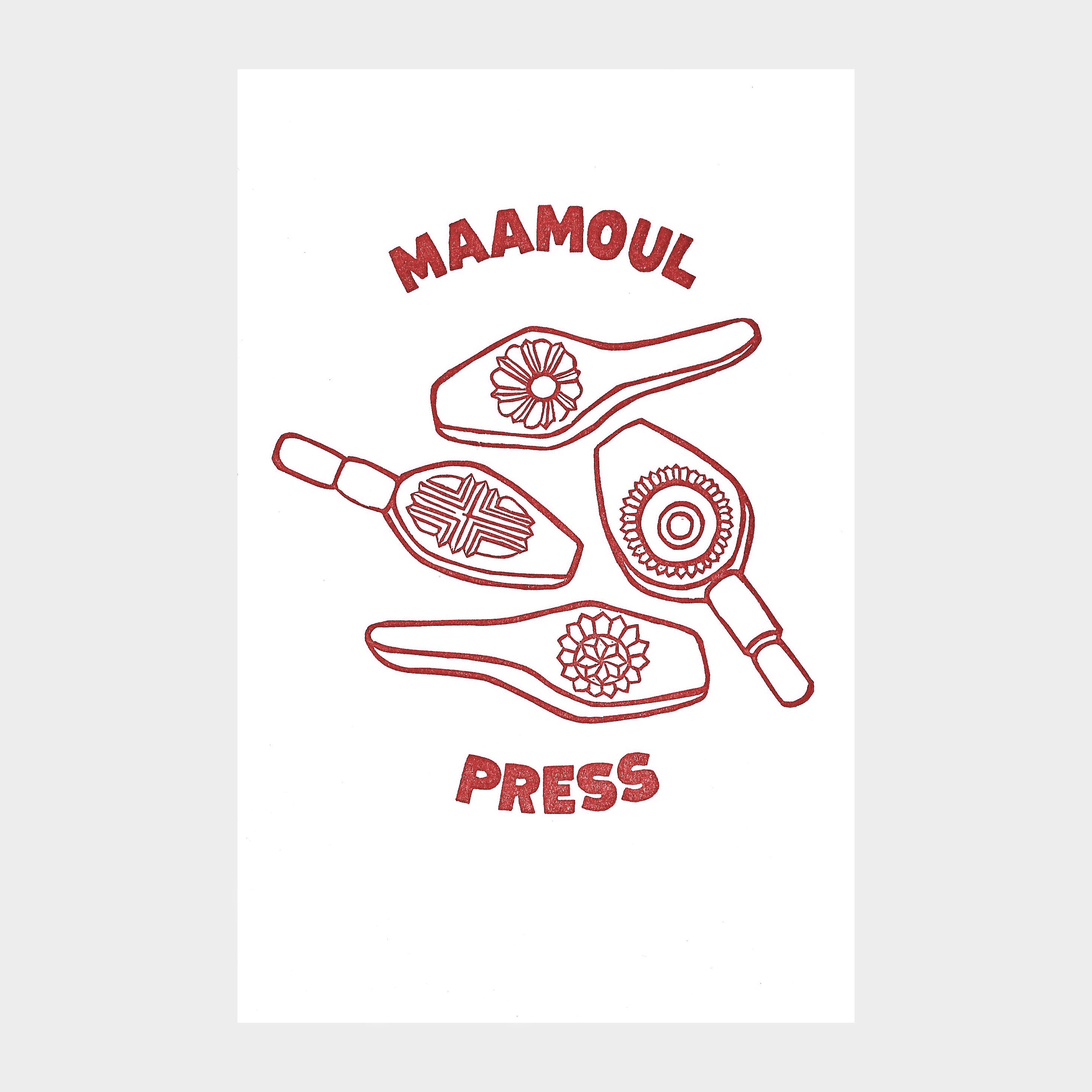 Linocut print, letterpress printed on off white 60# text paper. Sales from this print support Maamoul’s operating costs and allow us to continue our work.