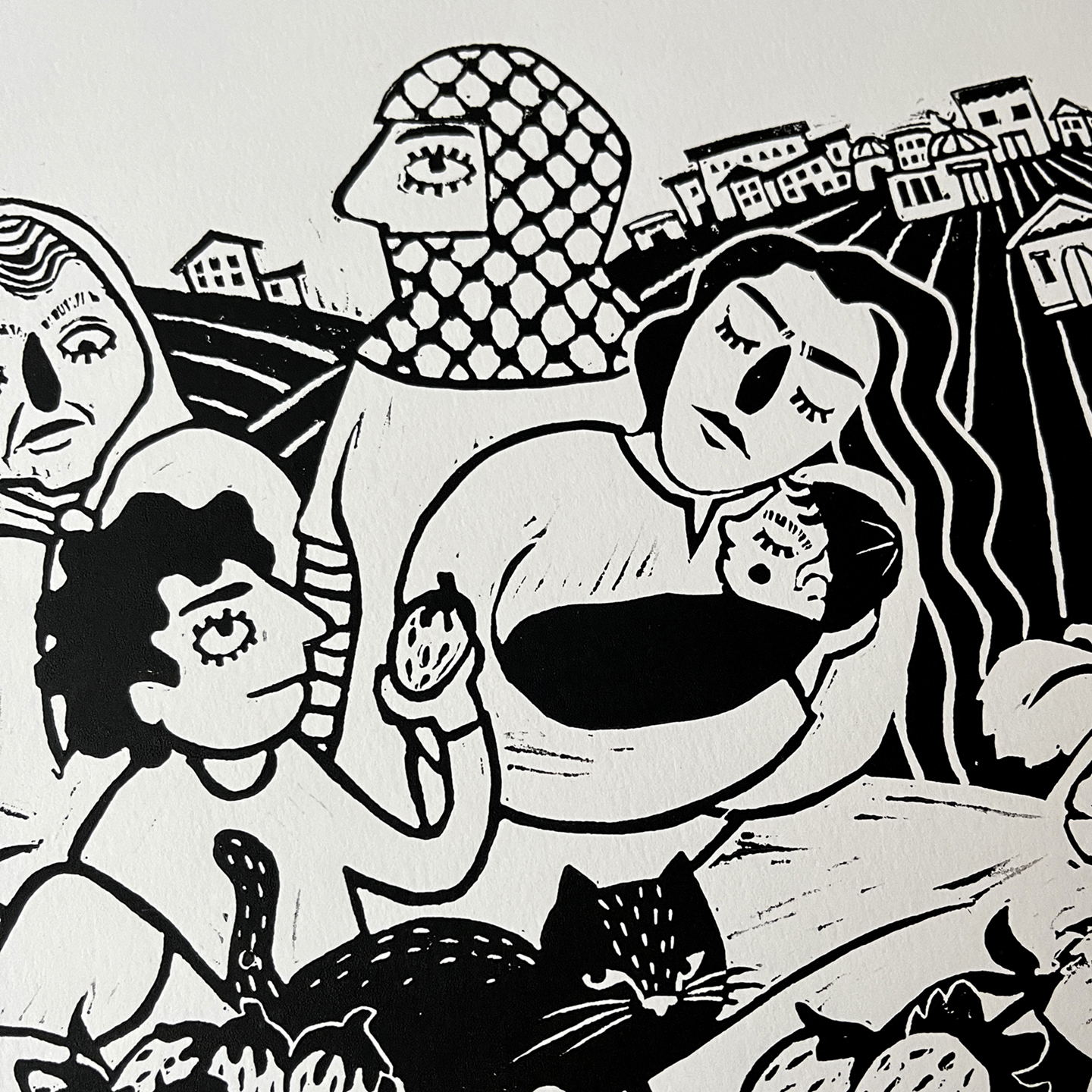 This limited edition large format print features a linocut illustration by Leila Abdelrazaq, paired with letterpress text printed by Aya Krisht from Arabic metal type. The illustration, summoning dreams of return and renewal, is paired with a verse of poetry by Gazan poet Heba Abu Nada, who was martyred in Gaza in October 2023. Heba’s poetry is printed with permission from her sister, Somaia.