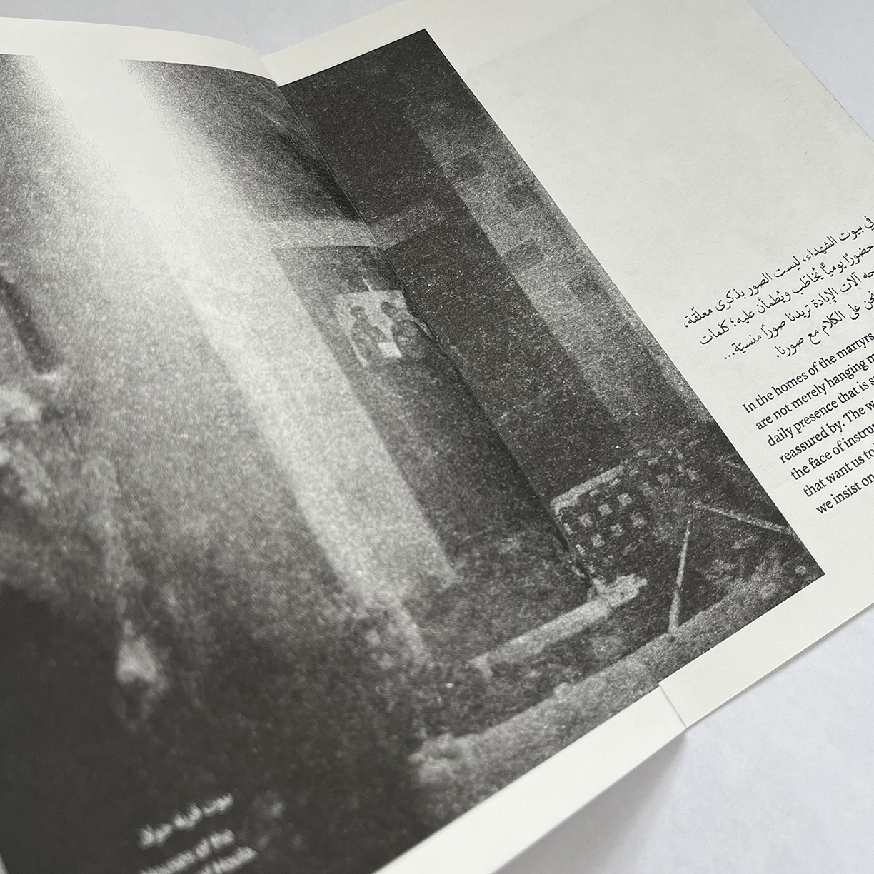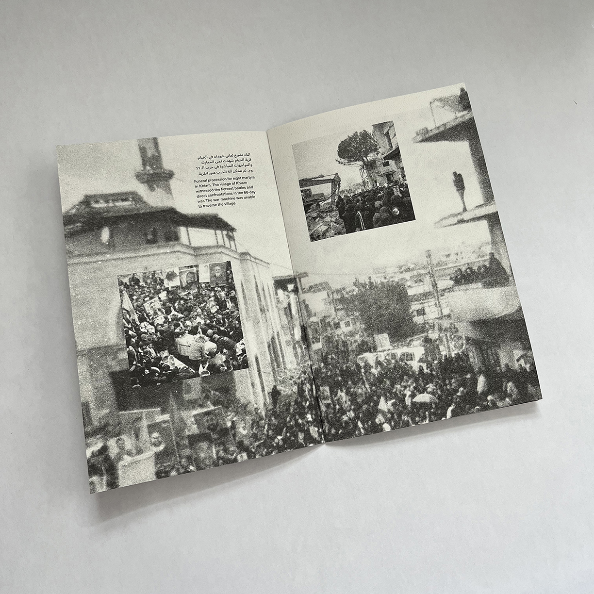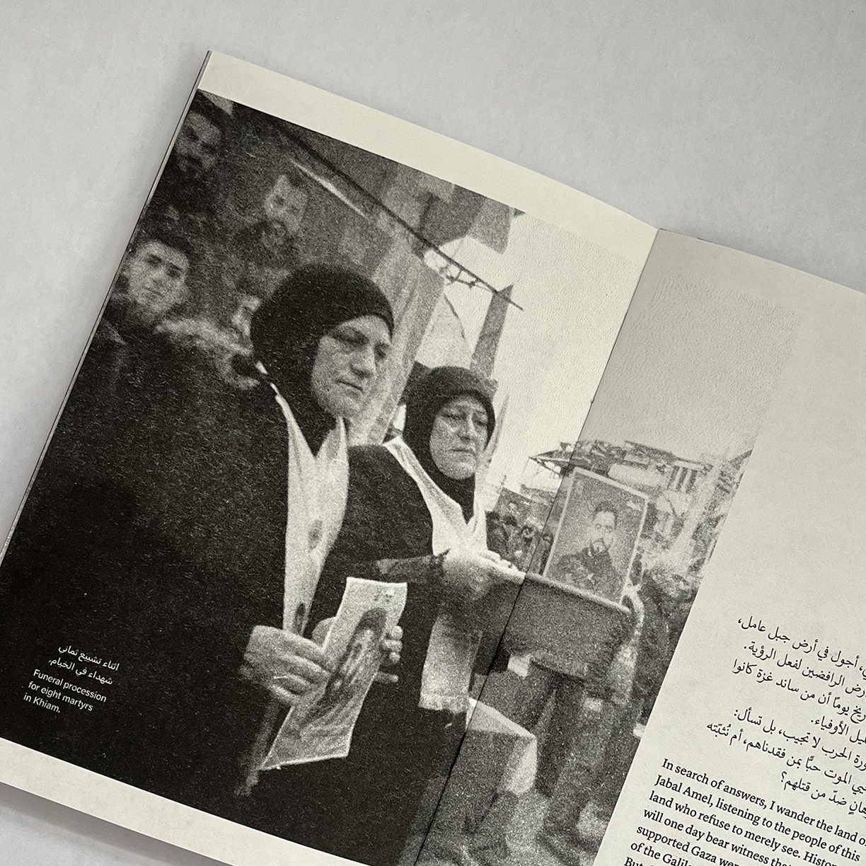 This bilingual (English and Arabic) zine collects analog photography and text by Fatima Joumaa, documenting scenes from South Lebanon during and after the war of the support front for Gaza, and interrogating the role of photography between witnessing and remembrance.